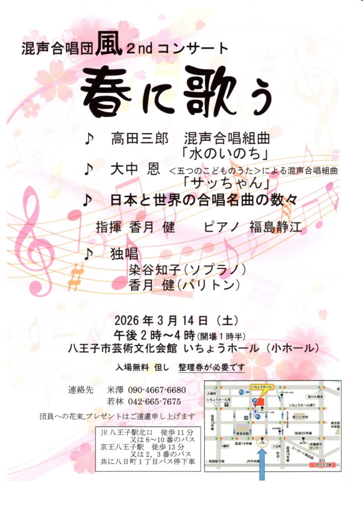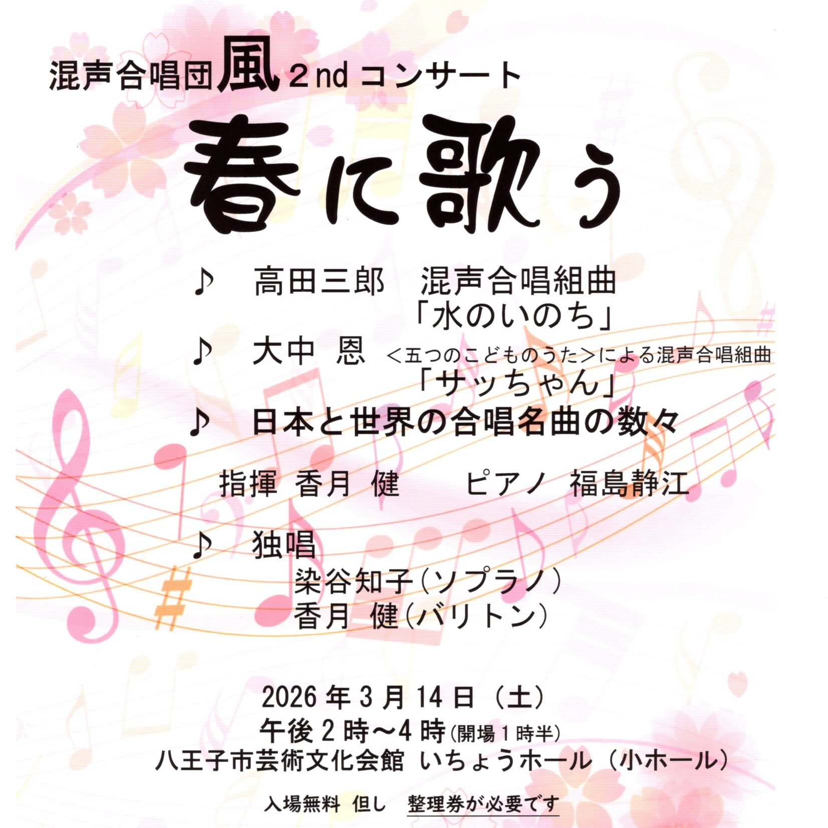 混声合唱団「風」コンサート 出演情報 2025.12.15 2026年3月14日(土)、八王子いちょうホールにて混声合唱団「風」のコンサートを行います。現在本番に向けて、毎週ビシビシと(楽しく)練習中です。懐かしいあの曲や、あっと驚くような曲も準備しています。どうぞお楽しみに。 混声合唱団「風」は、30年程前から活動しており、ながらく染谷知子先生が指導してこられました。現在は香月健が引き継ぎ、人生の大先輩たちと共に毎週木曜日、主に八王子市長房市民センターで練習しております。いつでも見学・お試し参加大歓迎です。ぜひご連絡ください。